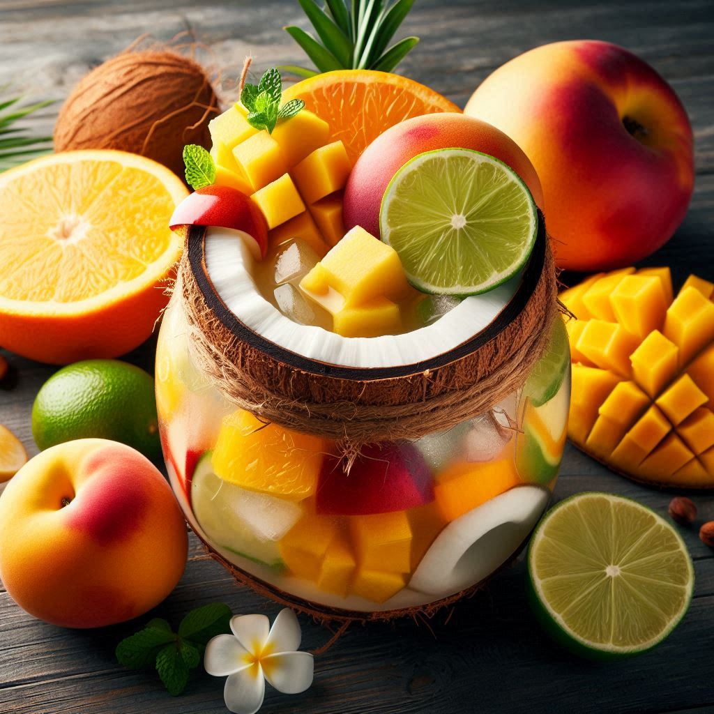 Fresh Coconut mixed with oranges, nectarines, mango, lemon, and lime pineapple