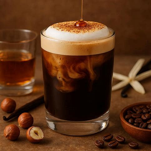 A smooth pour of bourbon and spiced whiskey stirred with espresso, coffee, and hazelnut, topped with marshmallow and a drizzle of maple. Finished with rich vanilla and warm tonka bean — bold, cozy, and downright irresistible.